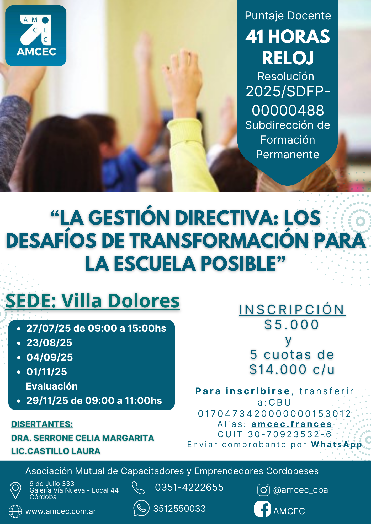 INSCRIPCIÓN: $5.000 + 5 cuotas de $14.000. La propuesta busca fortalecer la formación docente, brindando herramientas teóricas, legales y metodológicas útiles para revisar prácticas de gestión. Ideal para quienes ejercen o aspiran a cargos directivos o de supervisión.